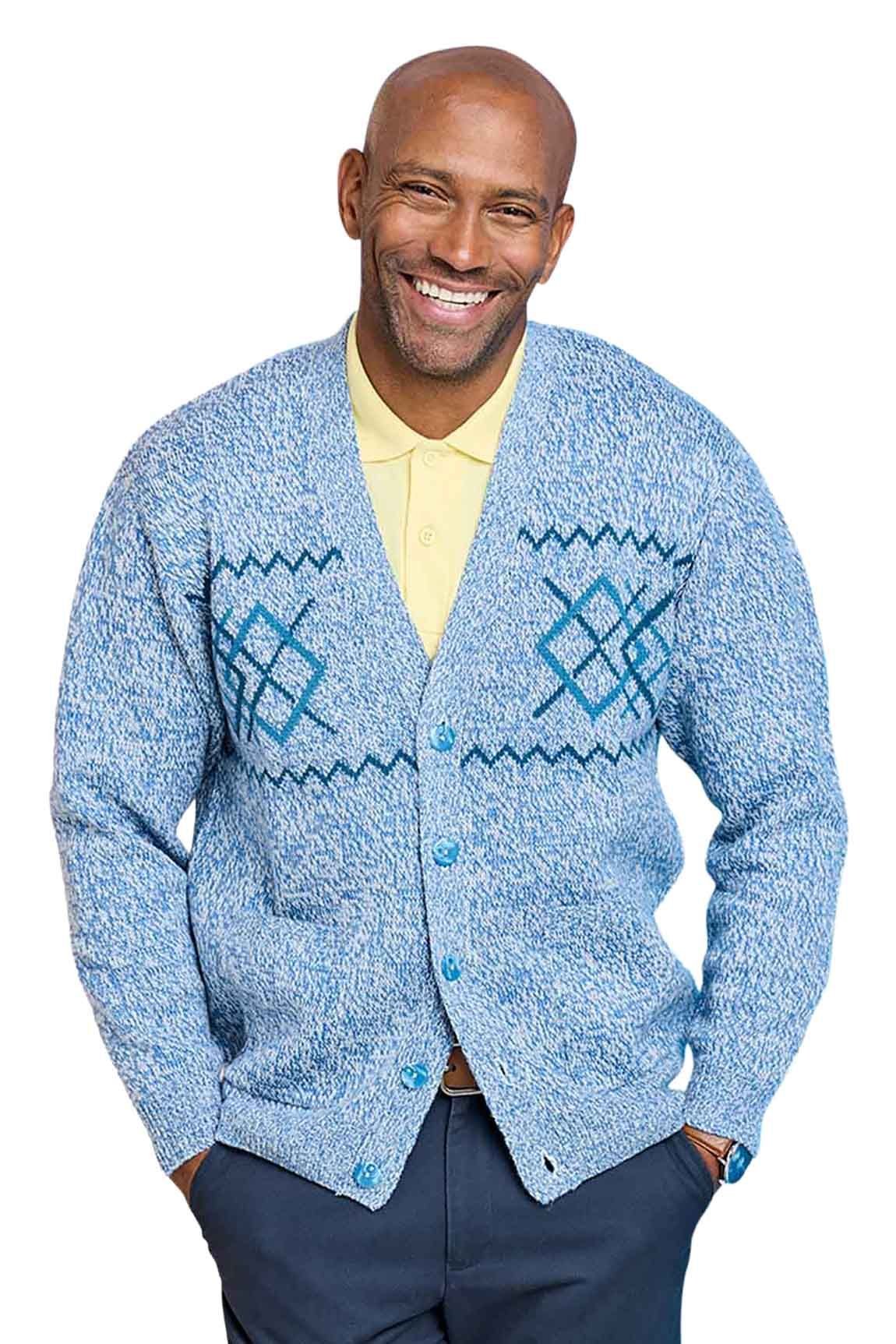 Classic jacquard cardigan in royal blue with a traditional pattern, perfect for smart casual wear. Features a full button-through design for versatile styling.