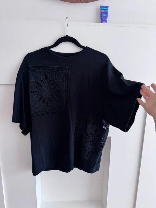 View Vinted's returns policyThis black oversized T-shirt from Topshop features crochet patches on the front. Designed for a relaxed fit, it's perfect for casual outings.