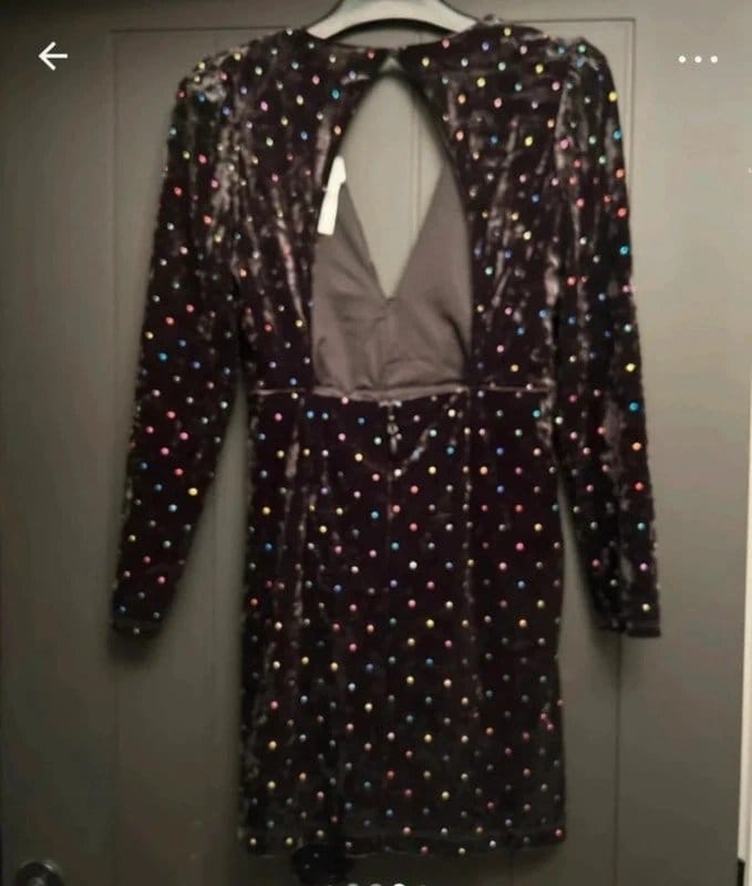 See all outfit ideasA stunning black velvet party dress from Topshop, featuring a polka-dot pattern and a deep V-neckline. The dress is lined and has a zip closure at the back. Perfect for evening events or special occasions.