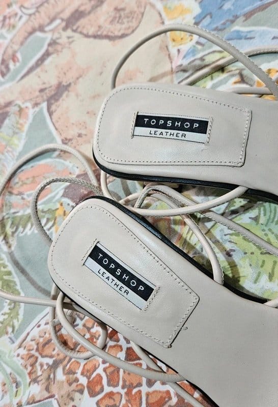 Elegant Topshop cream leather sandals with a square toe and chunky kitten heel. The tie-up ankle design adds a touch of sophistication. Perfect for adding a stylish edge to any outfit.