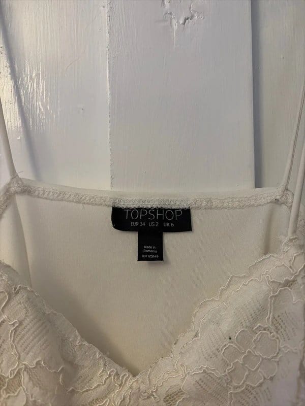 Elegant cream lace bodysuit from Topshop featuring a delicate lace pattern across the bust, shoulders, and back. The V-neckline and thin adjustable straps add a touch of sophistication. Perfect for special occasions or intimate settings.
