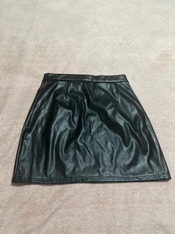 The Topshop Black Leather Mini Skirt is available in sizes M.