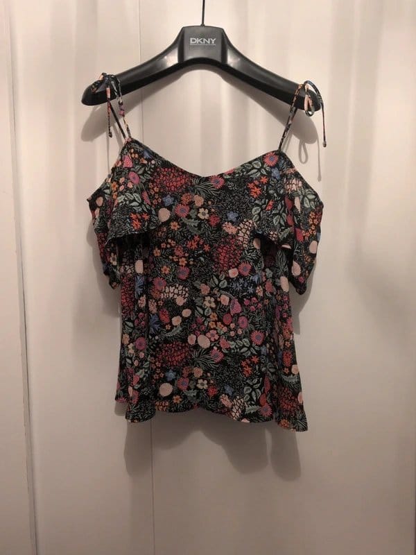 Charming multi-coloured floral off-shoulder top by Topshop. Features a lightweight fabric with a floral print and ruffled sleeves. Perfect for casual outings.