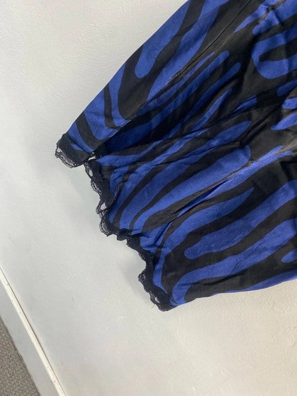 Elegant midi skirt in navy and black zebra print satin with delicate lace trim around the hem. Perfect for evening events or a night out.