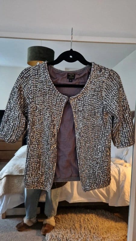 The Topshop Silver Sequin Embellished Jacket is available in sizes S.
