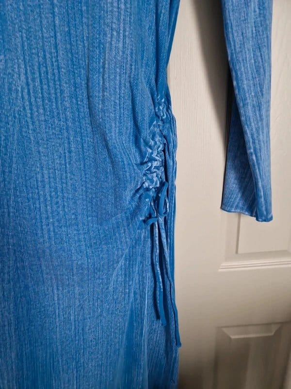 Stylish blue washed denim midi dress with a ruched side detail and a size 14/16. Perfect for casual outings or a relaxed day look.