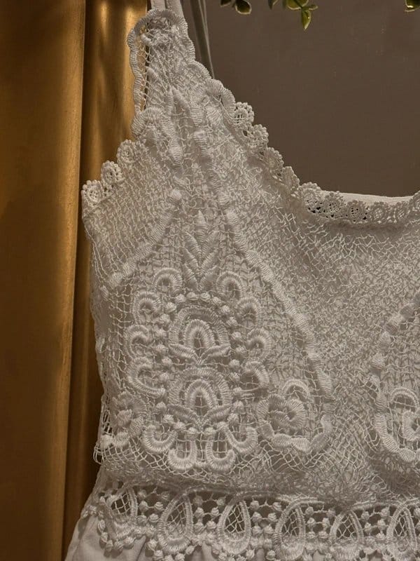 Charming white lace midi dress with intricate lace details on the top half. Features spaghetti straps and hits around mid-thigh. Ideal for special occasions like bridal showers and graduations.