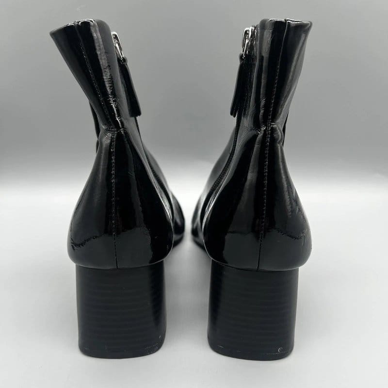 These black shiny dominatrix faux leather ankle boots from Topshop feature a sleek design with a block heel and zipper closure. Perfect for adding a touch of edginess to any outfit.