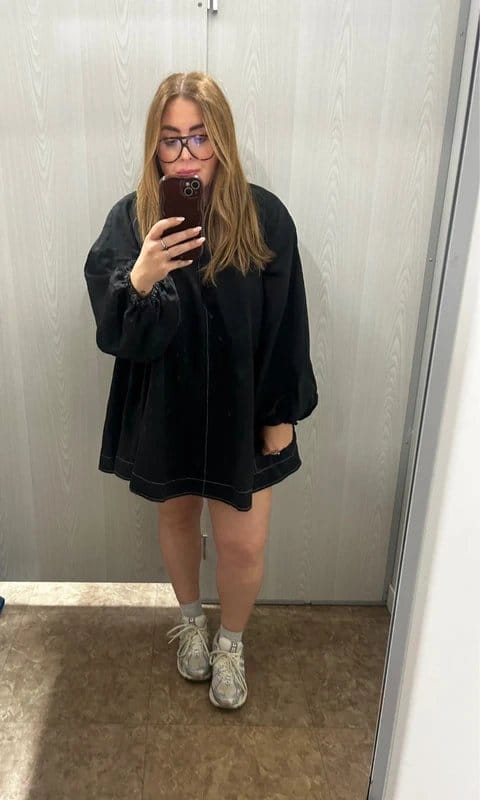 This black cotton smock dress features ecru stitching and side seam pockets. It's a versatile piece perfect for casual outings.