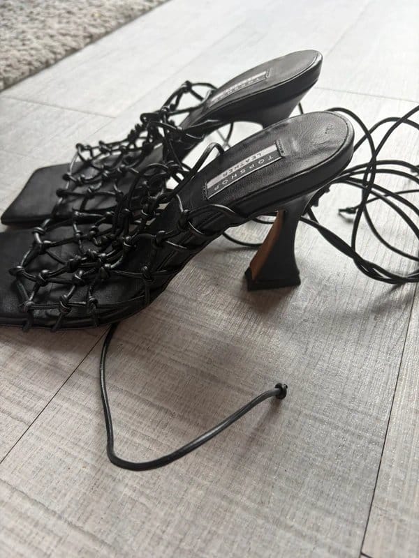 Elegant black lace-up heels by Topshop, featuring a square toe and high-fashion design. Perfect for adding a touch of sophistication to any outfit.
