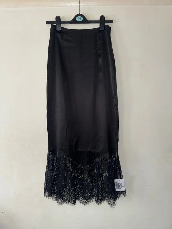 The Topshop Black Satin Maxi Skirt with Lace Hem Size 8 is available in sizes S.