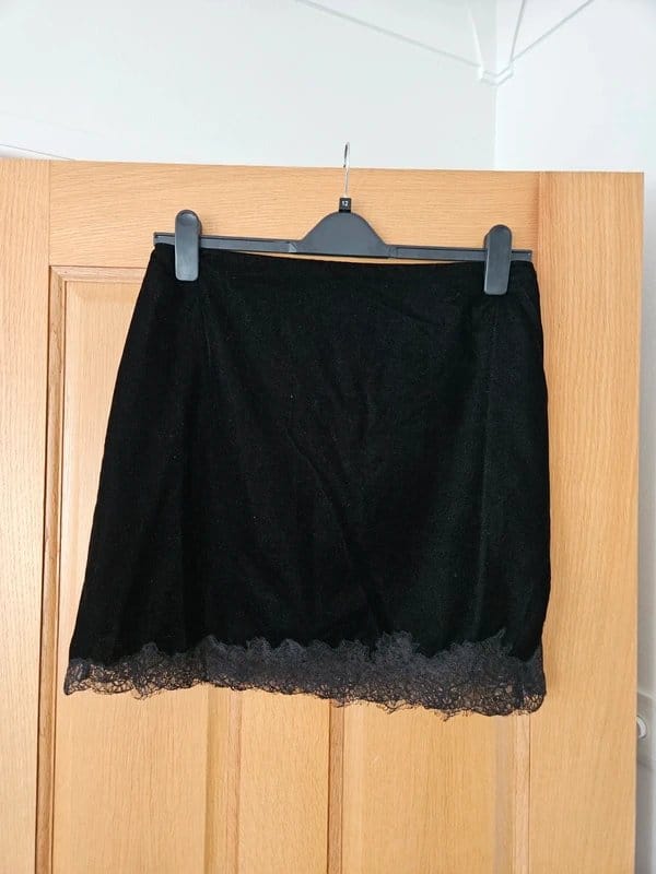 This black velvet mini skirt from Topshop zips up at the side and features delicate lace detailing around the bottom. Perfect for a touch of elegance in your wardrobe.