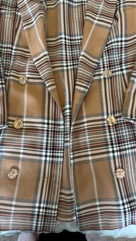 View Vinted's returns policyStylish plaid blazer from Topshop's LOVE collection. Featuring a double-breasted front, buttoned cuffs, and a classic check pattern in beige and brown tones. Perfect for a smart-casual look.