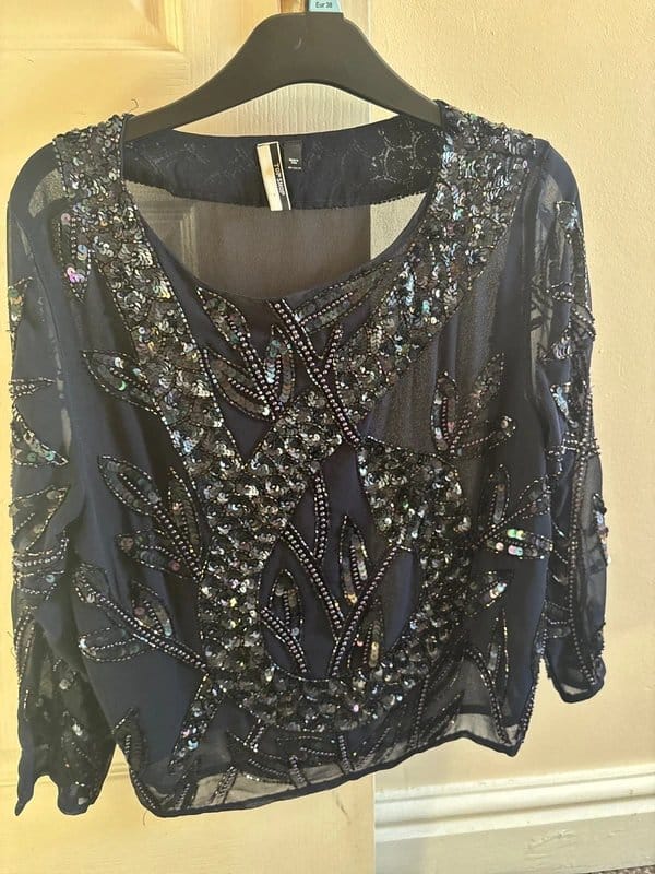 The Topshop Navy Sequin Blouse is available in sizes M.