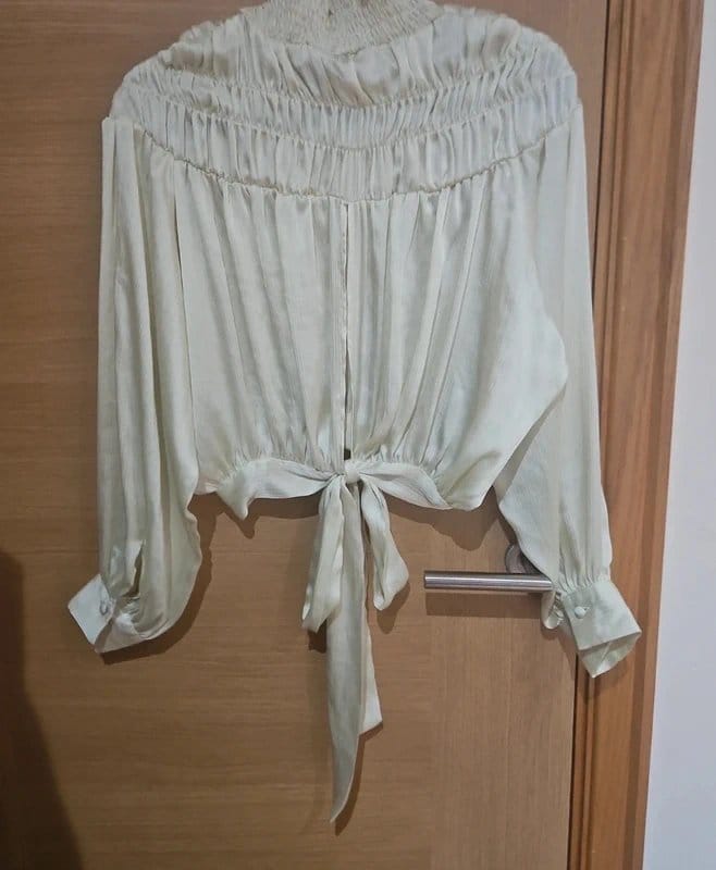 View Vinted's returns policyThis cream chiffon blouse from Topshop features a high neck and tie-front detailing. The lightweight fabric and elegant silhouette make it perfect for casual or semi-formal occasions.