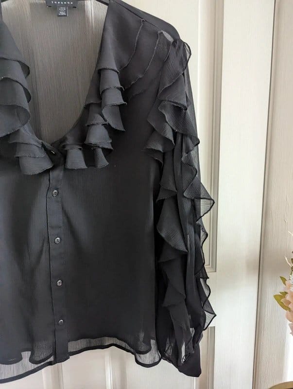 View Vinted's returns policyThis black chiffon blouse from Topshop features a ruffled neckline and sleeves for a gorgeous and flattering look. Size 10 fits sizes 8-12.