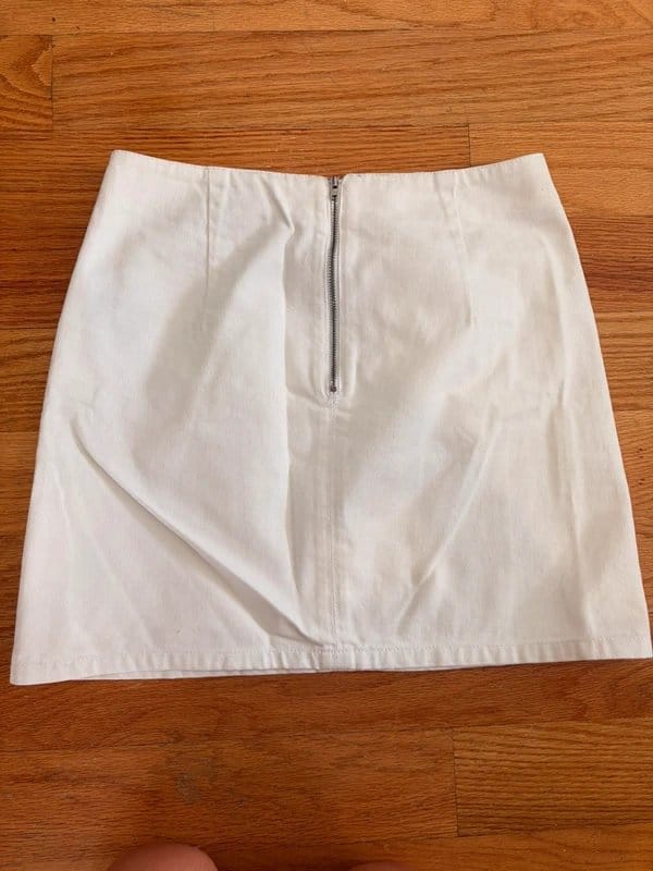 This white denim mini skirt from Topshop is perfect for summer. Made from durable denim, it features a classic mini length and a zip closure for easy wear.