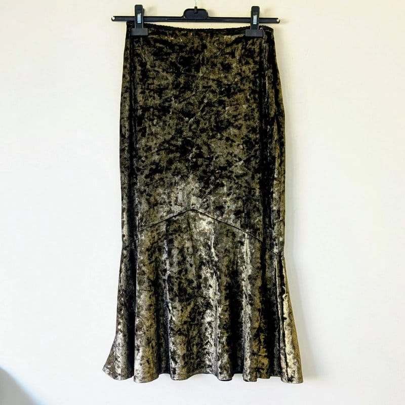 Luxurious gold and black velvet fishtail midi skirt from Topshop. Features a stretchy material and a high waistband. Perfect for evening events or special occasions.