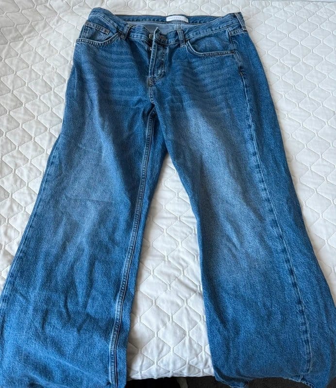 Stylish Topshop blue denim low rise wide leg jeans. Perfect for a casual look with their relaxed fit and classic denim fabric.