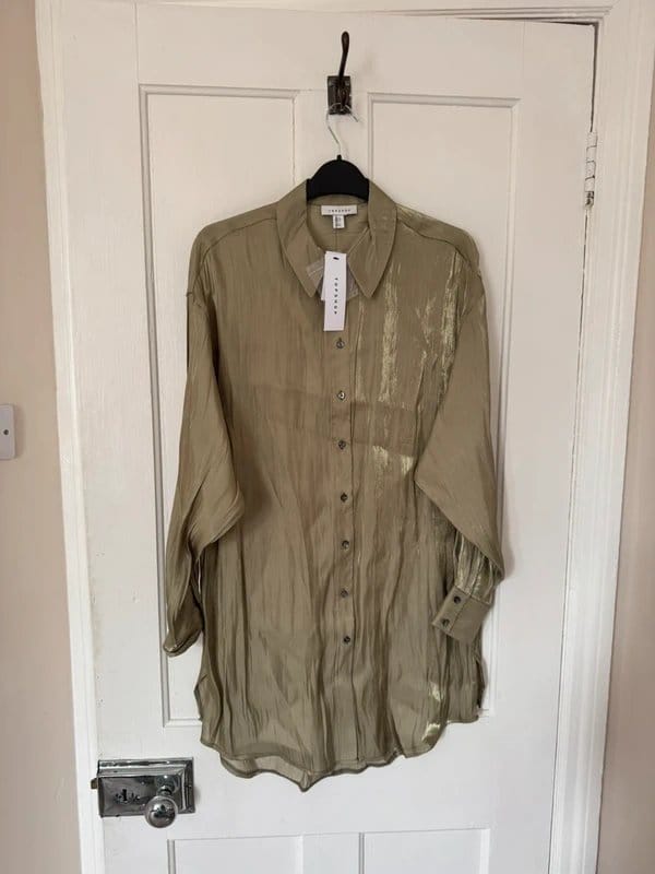 The Topshop Khaki Satin Shirt is available in sizes S.