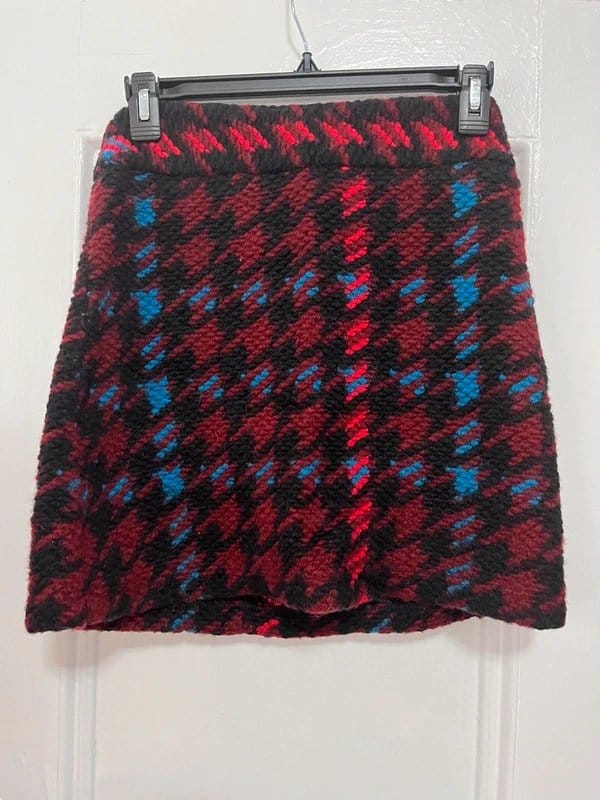 Bold multi-coloured knit skirt from Topshop. Featuring a thick knit texture and a vibrant houndstooth pattern in red, black, and blue. Perfect for a casual yet stylish look.