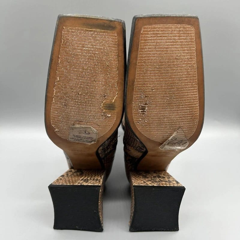 These Topshop ankle boots feature a snake print leather upper with a square toe and block heels. Designed for a bold fashion statement, they are perfect for adding an edgy touch to any outfit.