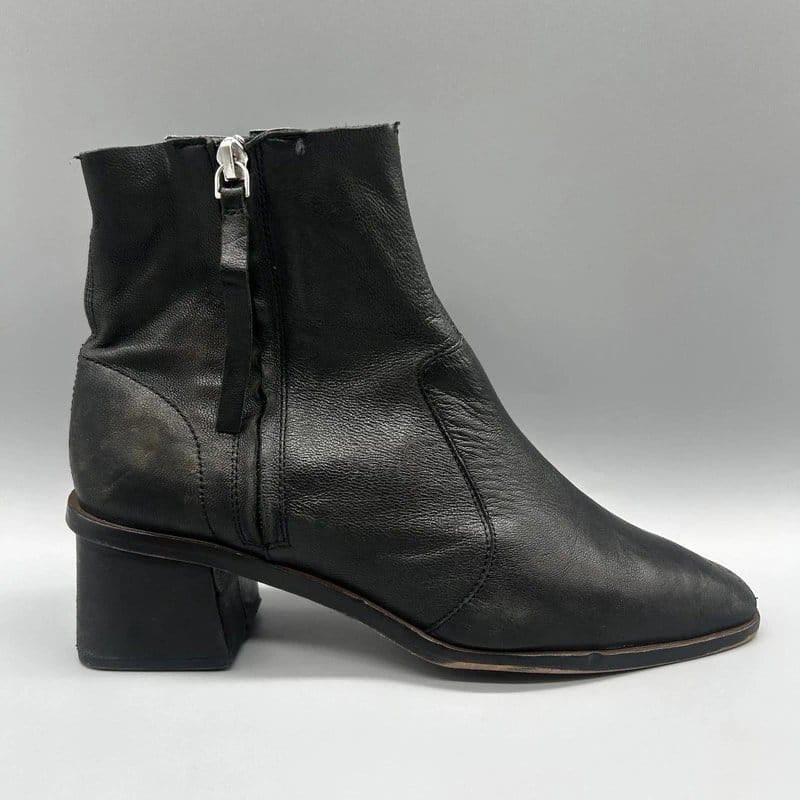 Stylish black leather ankle boots with a soft leather upper and block heels. The boots feature a zip closure for easy wear and a chunky heel for added height. Perfect for both casual and dressy outfits.