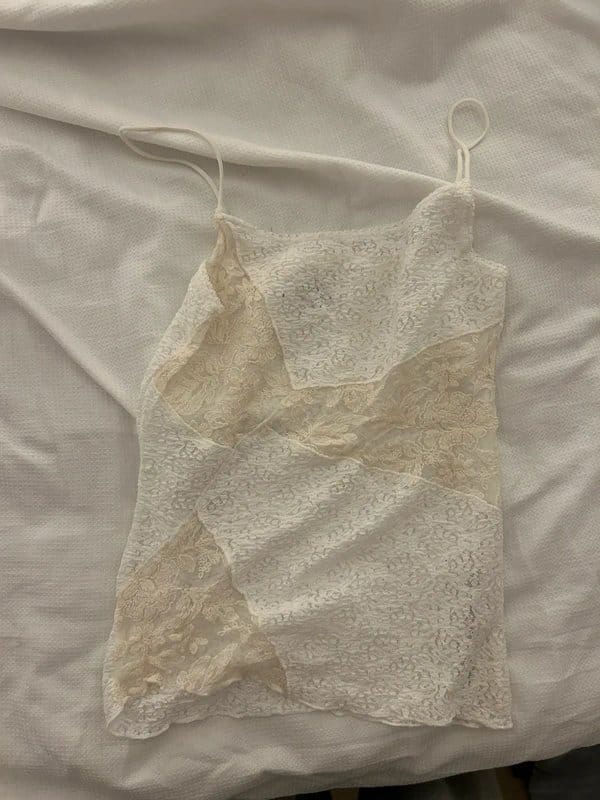 See all outfit ideasDelicate cream lace and mesh sleeveless top with intricate lace patterns. Perfect for a romantic and feminine look.