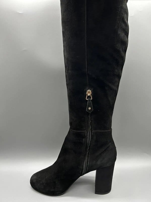 Elegant black suede over-the-knee boots with a block heel and zip closure. Perfect for adding a touch of sophistication to any outfit.
