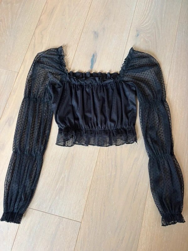 This black polkadot blouse top by Topshop features a beautiful mesh/tulle material with a polkadot pattern. It has a crop top silhouette with long sleeves and a gathered neckline. Perfect for casual or evening wear.