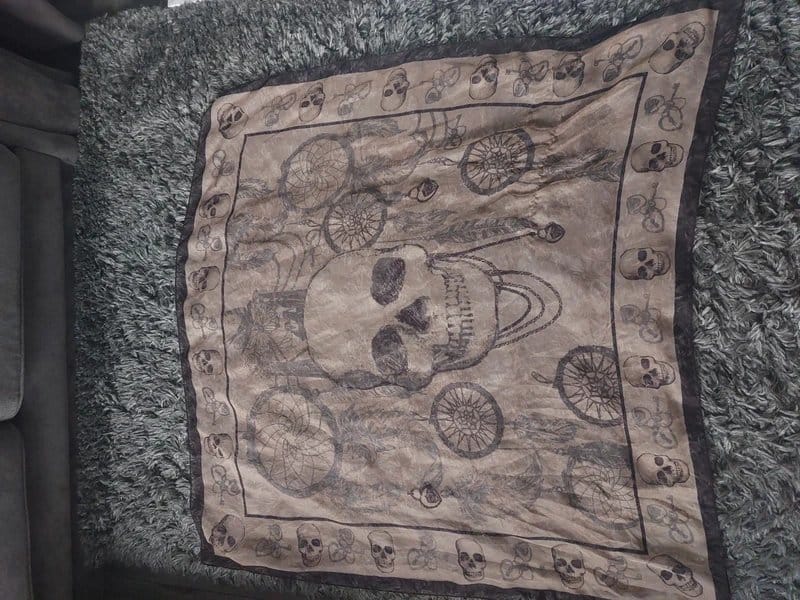 This multi-coloured chiffon scarf from Topshop features a unique skull and wheel design. The lightweight fabric adds a touch of bohemian flair to any outfit.