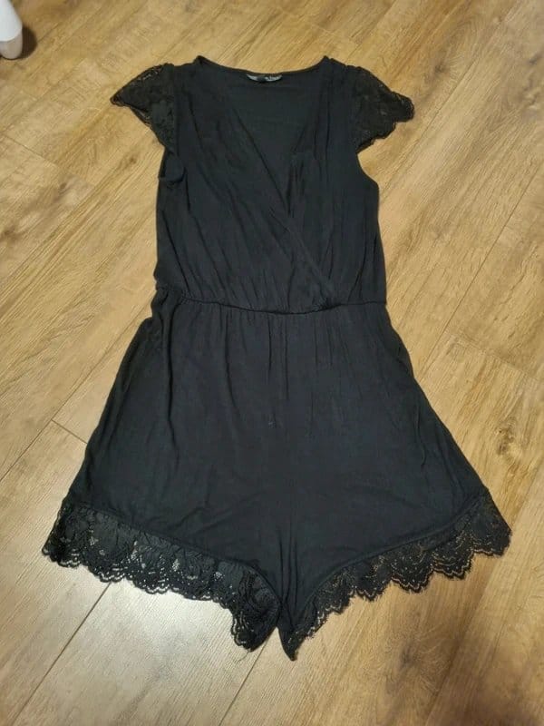 The Topshop Black Lace Trim Playsuit is available in sizes M.