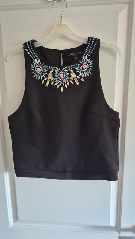 The Topshop Black Embellished Satin Crop Top is available in sizes M.