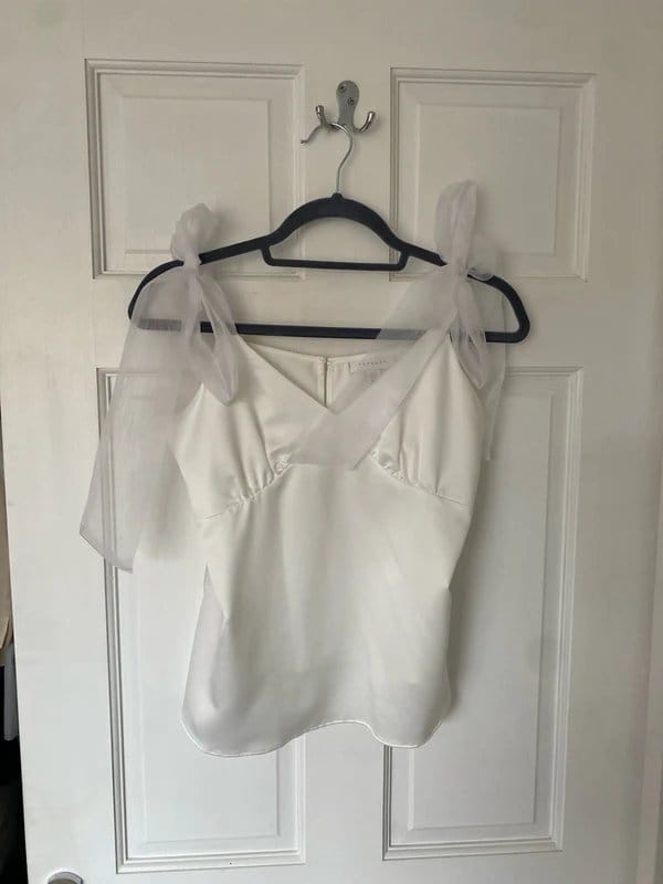 This satin cami top by Topshop features a white/cream colour and tulle bow tie shoulders. It's perfect for a casual yet elegant look.