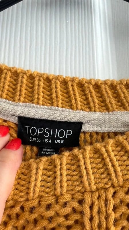 View Vinted's returns policyThis yellow knit sweater from Topshop features a bulky, textured knit fabric in a vibrant mustard colour. The relaxed fit and round neckline make it a cozy addition to any wardrobe.