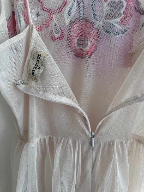 Charming cream tulle layered midi dress from Topshop, featuring delicate embroidery and a lightweight tulle fabric. Originally longer, it has been trimmed to a flattering midi length. Ideal for special occasions or evening wear.