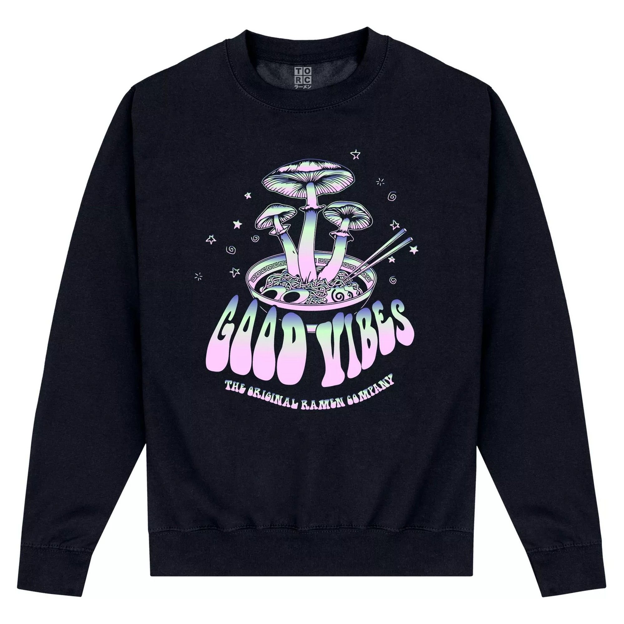 Casual long-sleeved sweatshirt in black with a vibrant multi-coloured print of ramen and mushrooms. Made from a blend of 80% ringspun cotton and 20% polyester, it offers a soft yet durable feel. Perfect for everyday wear.