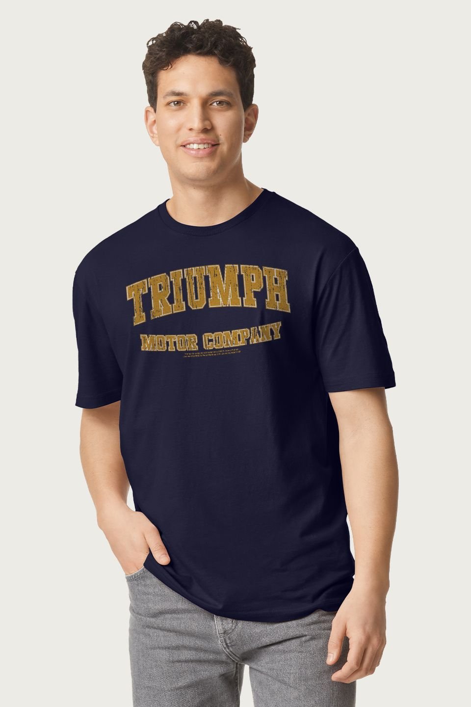 Officially licensed Triumph Motor Company t-shirt in navy blue. Made from 185gsm pre-washed cotton, this mid-weight tee offers a comfortable and classic fit. Features a crew neck rib collar with taped neck and shoulders.