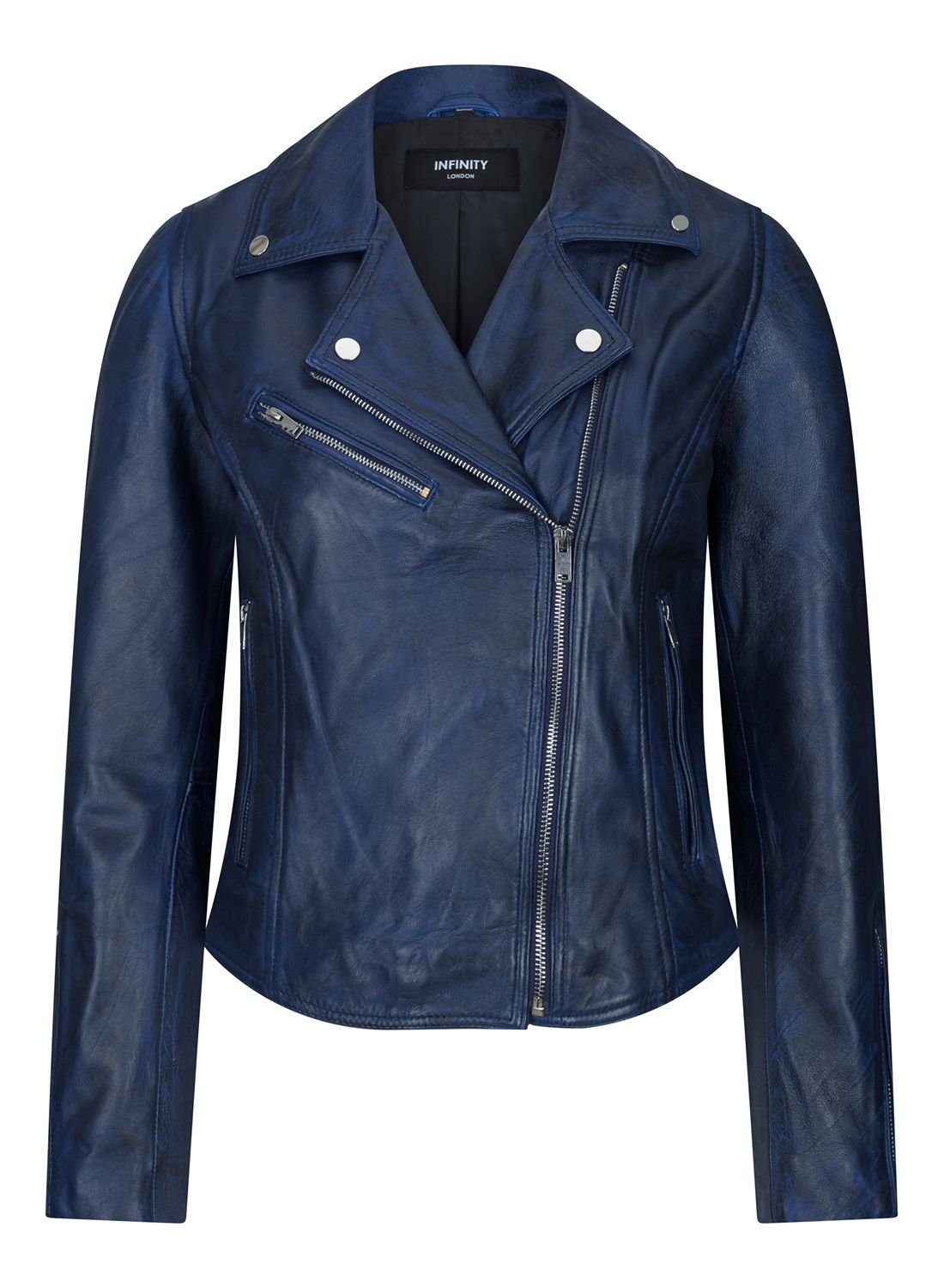 The TruClothing Blue Leather Biker Jacket for Women is made from leather.
