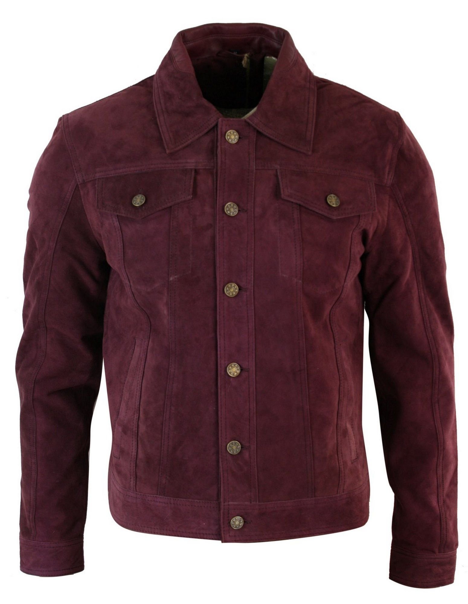 Classic vintage denim style jacket in burgundy suede leather. Features a soft goat split suede exterior and polyester lining for comfort. Ideal for casual wear all seasons.