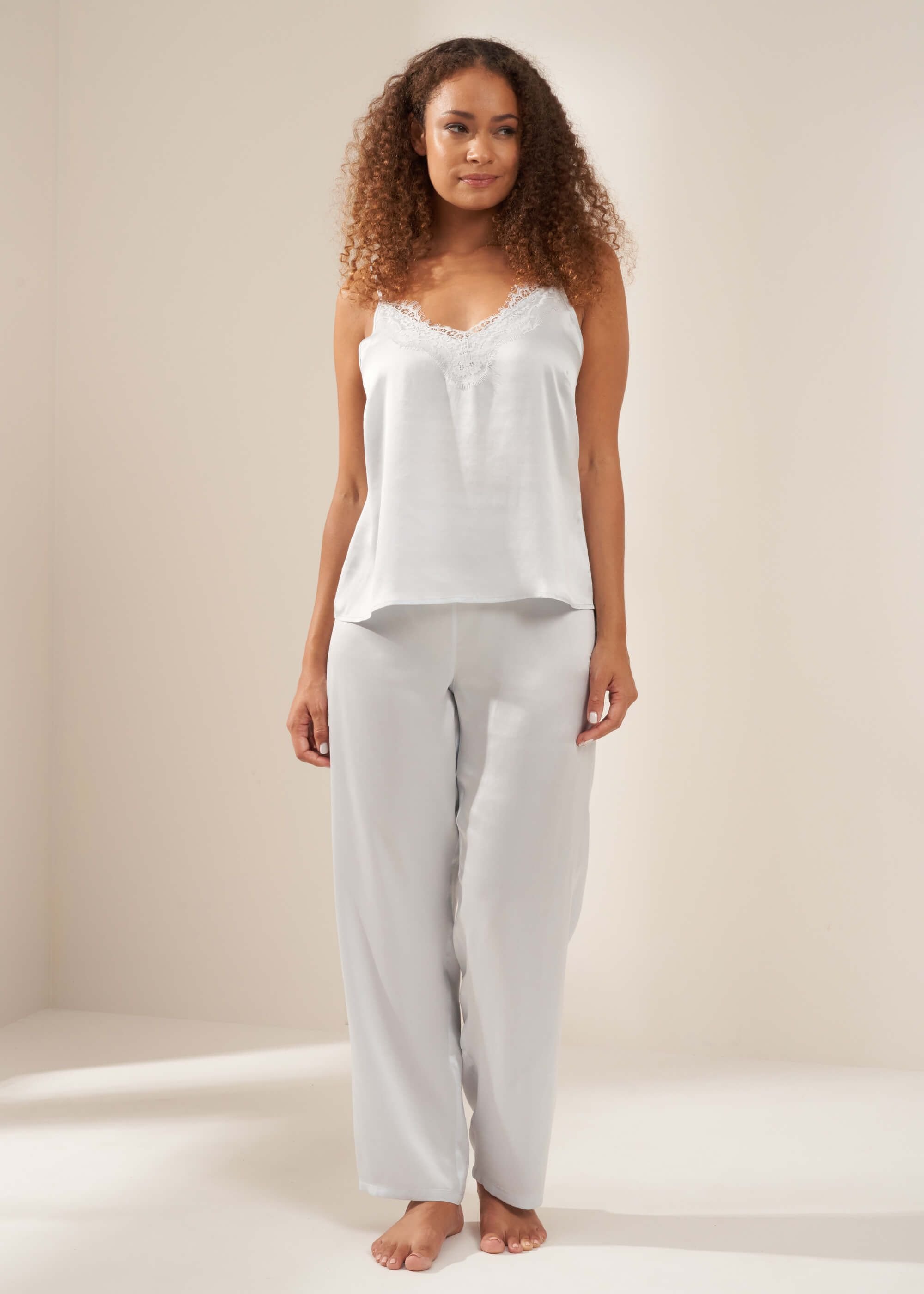 Embrace feminine elegance with our silk cami and trouser set, available in midnight, dusty pink and baby blue. Made from luxurious 16 momme silk, this beautifully soft two-piece features delicate French lace across the bust and adjustable sliding straps, paired with straight-leg trousers with an elasticated waistband.