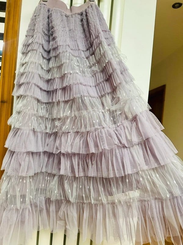 This beautiful dusky lilac tulle skirt features delicate silver and gold threading on the tulle. The stretchy waist ensures a comfortable fit, making it perfect for any event.