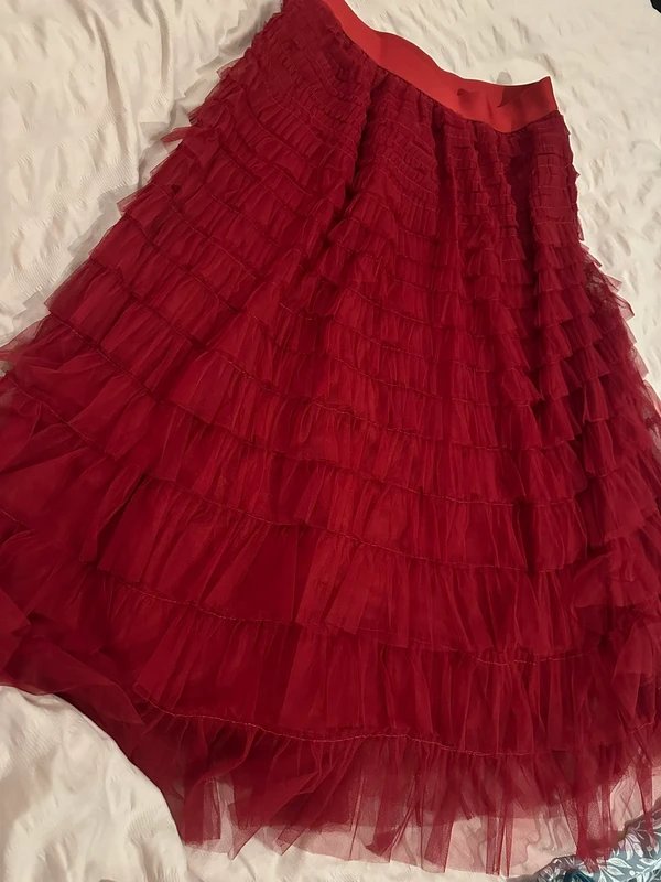 The Tulle Gothic Festival Midi Skirt in Burgundy is available in sizes L.
