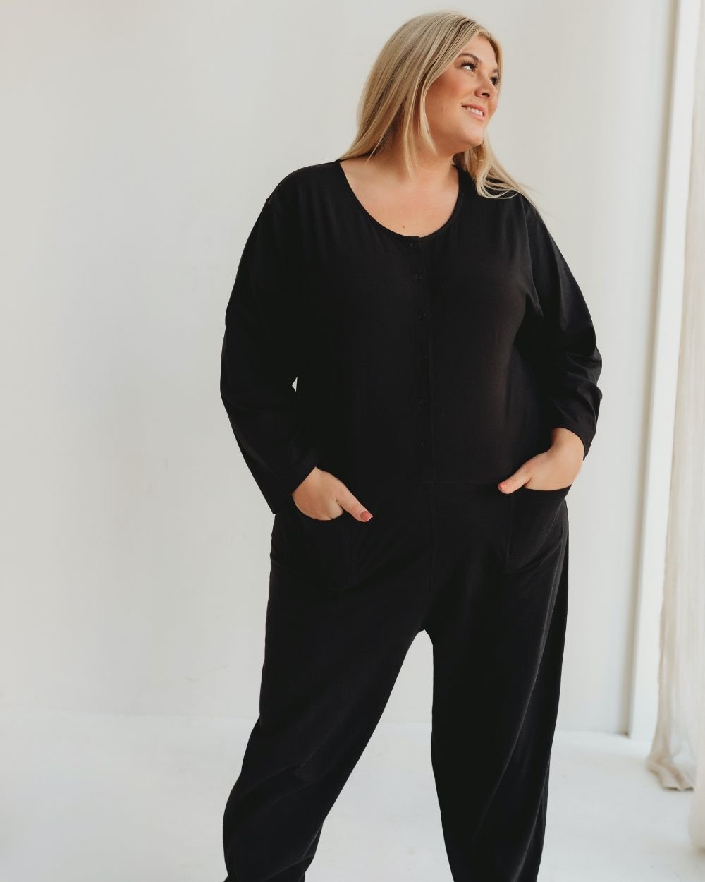 The Turtledove London Black Cotton Long Sleeve Jumpsuit is available in sizes 12, 14-18, 18-22.