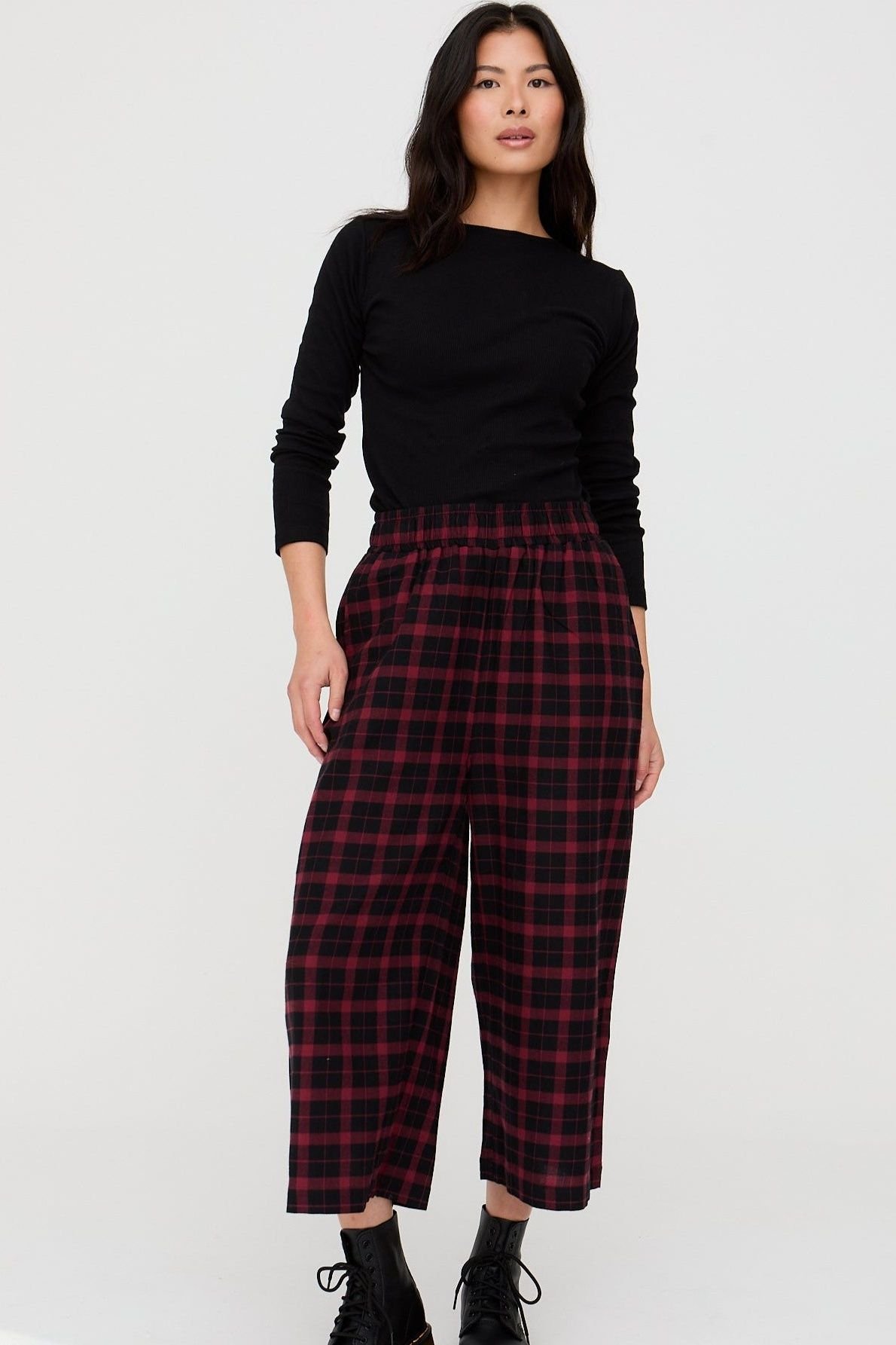 Playful red check trousers made from 100% GOTS certified cotton. Featuring a comfort-fit elasticated waistband, patch pockets, and a cropped hem length. Ideal for relaxed styling.