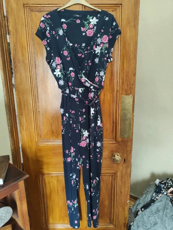 The Twiggy Navy Floral Jumpsuit is available in sizes L.