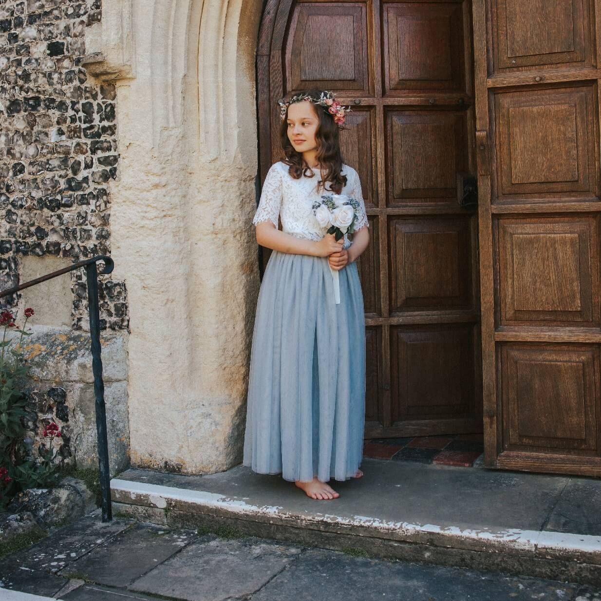 Charming silver grey flower girl set featuring an off-white lace crop top with delicate faux pearl buttons and intricate lace detailing. Paired with a soft grey tulle skirt for a classic, refined look. Perfect for special occasions.