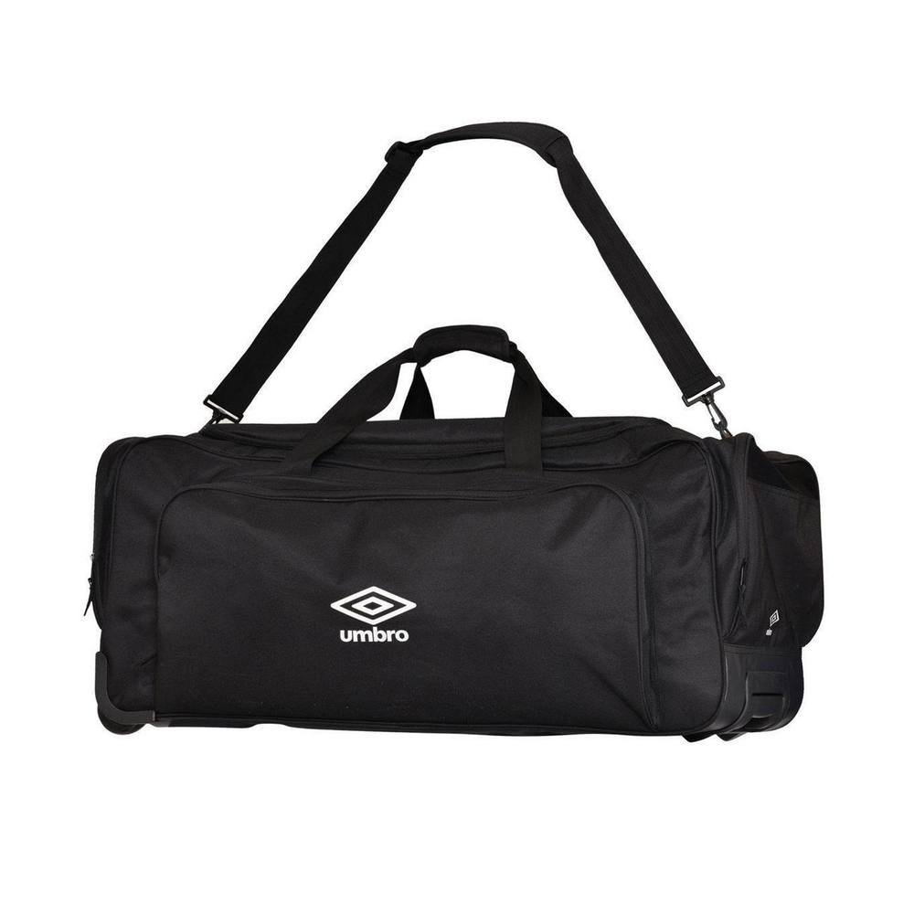 Stylish black duffel bag from Umbro, crafted from durable 600D polyester. Features a two-way zip closure, adjustable shoulder strap, and two wheels for easy transport. Ideal for sports or travel.