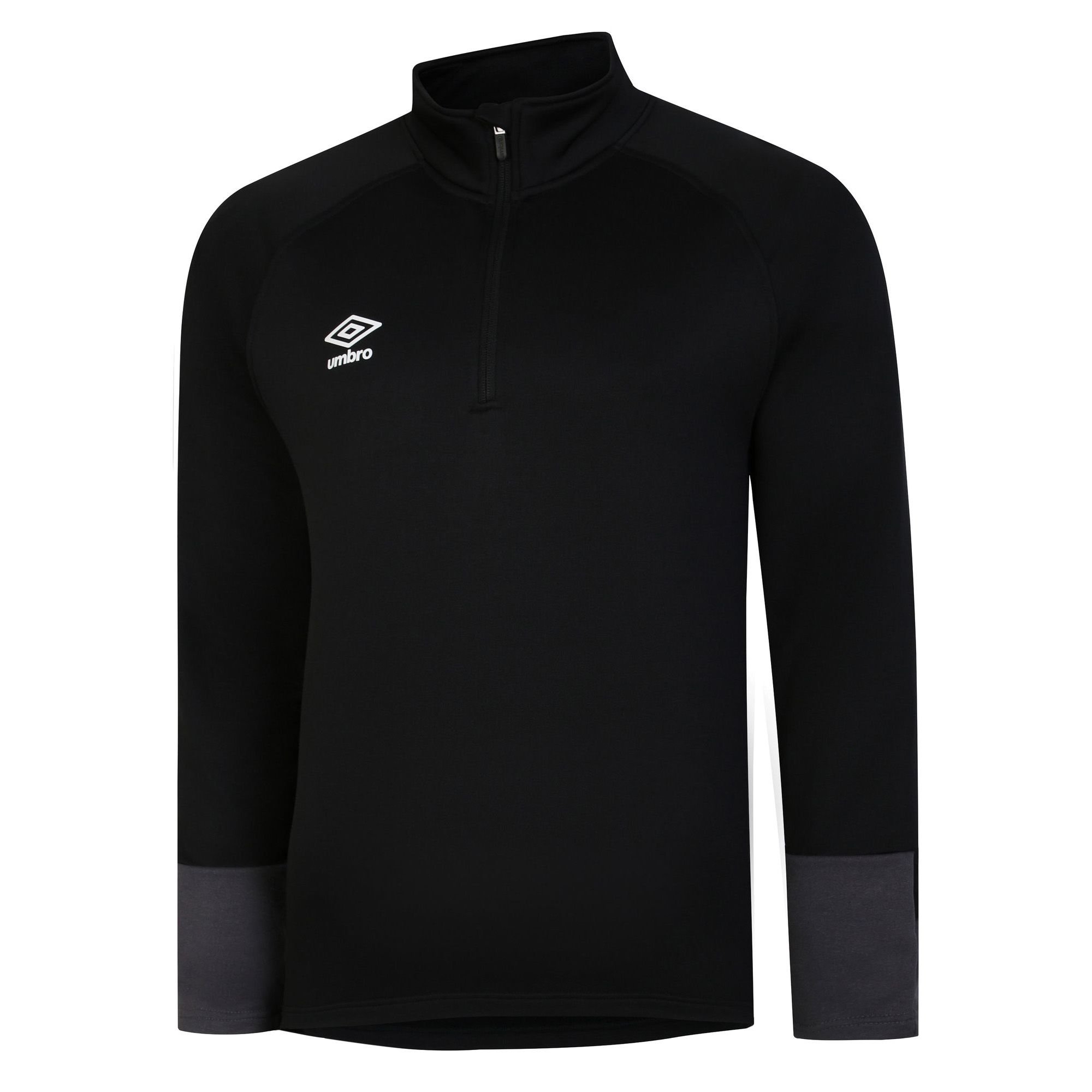 Sleek black training jacket by Umbro with a ribbed standing collar and auto lock zip fastening. Features contrast detailing and the iconic Umbro logo. Ideal for active wear and casual outings.