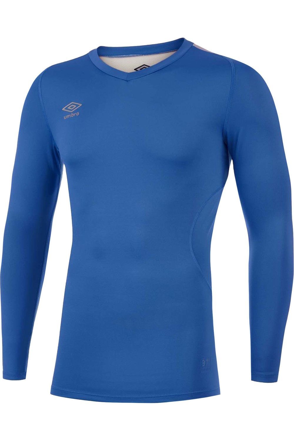 Stylish blue Umbro V-neck long-sleeve base layer top. Made from stretchy single jersey fabric with ergonomic seams and a mesh back panel for breathability. Ideal for active wear and sports.